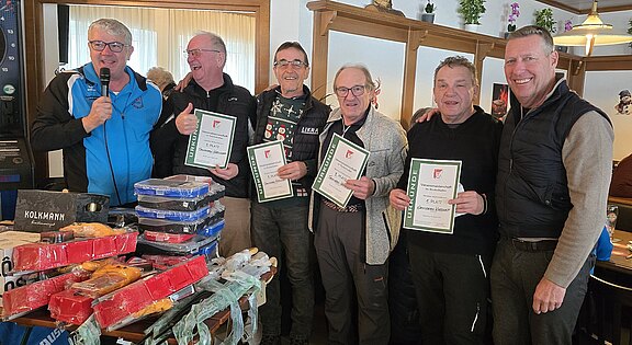 Zum Foto mit Sektionsleiter Hannes Spenlingwimmer der Siegermoarschaft Plotz Karl, Stingeder Johannes, Back Josef, Scheuchenegger Gerhard und Bgm. Wolfgang Greil v.l.n.r. sei noch gesagt: „So sehen Sieger aus!“